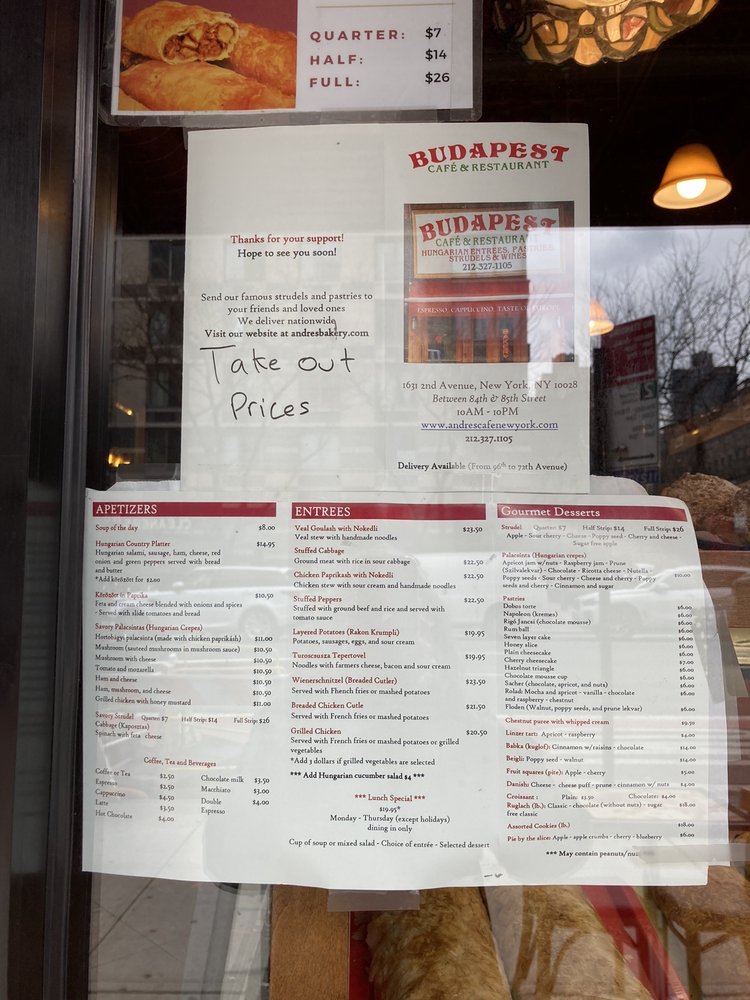 Budapest Cafe and Restaurant, located in New York City, offers a taste of Hungarian cuisine in a cozy setting. From Hungarian Country Platter to Veal Goulash with Nokedli, the menu boasts traditional dishes that are flavorful and satisfying. The desserts, especially the pastries, are a highlight according to customers. The ambiance is laid-back and perfect for a quiet meal or grabbing pastries on the go. Service is friendly and efficient, ensuring a pleasant dining experience. If you're looking to explore Hungarian flavors or indulge in delicious pastries, Budapest Cafe and Restaurant is a must-visit spot.